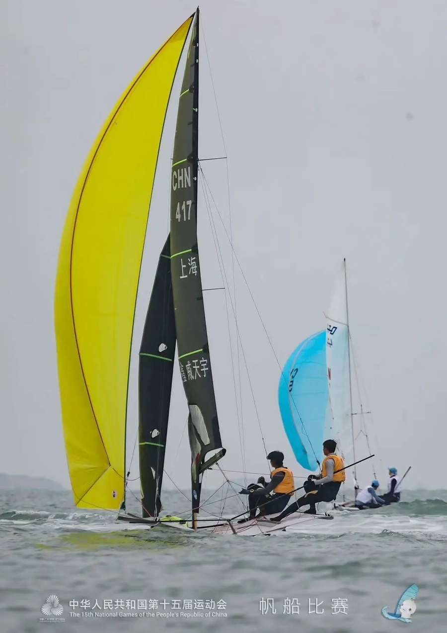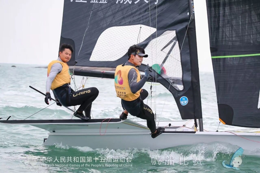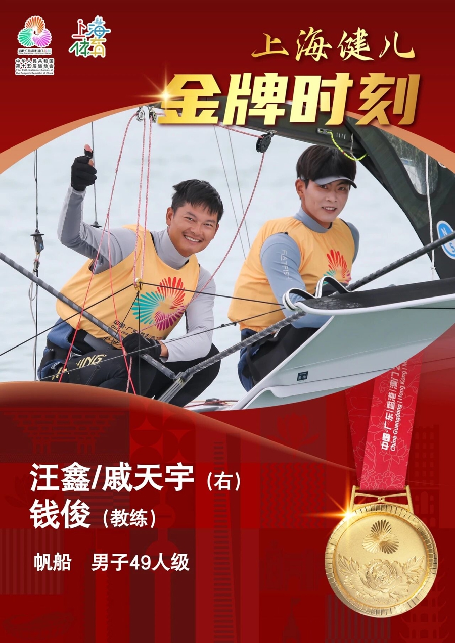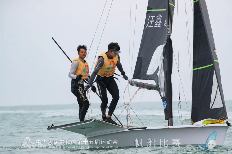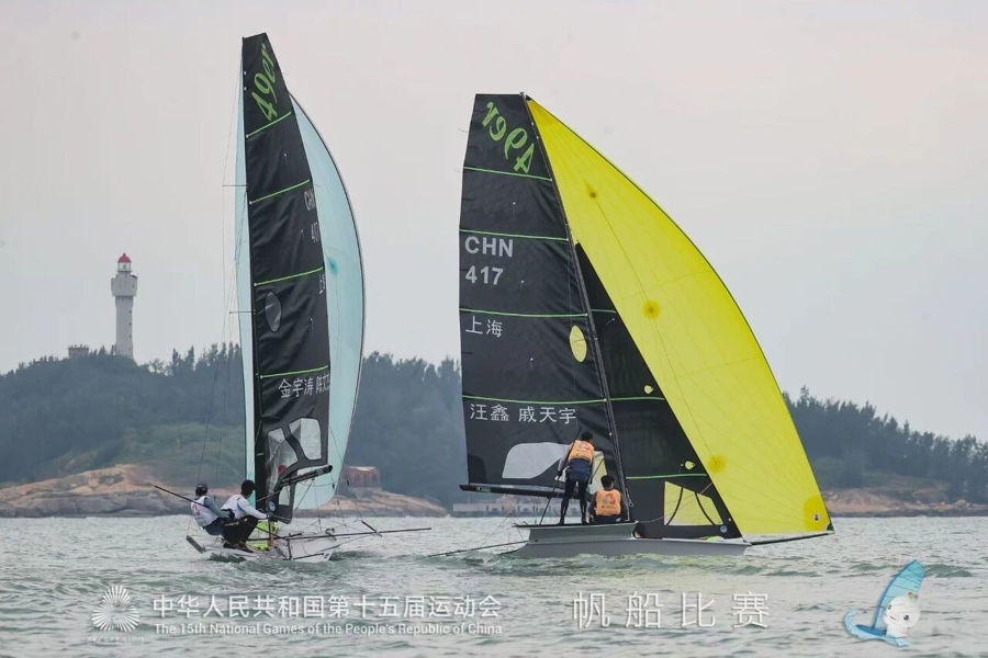 10月29日,第十五届全国运动会帆船项目男子49人级-第二阶段-第14轮的比赛在广东海上项目训练中心落幕,上海运动员汪鑫/戚天宇夺得冠军!