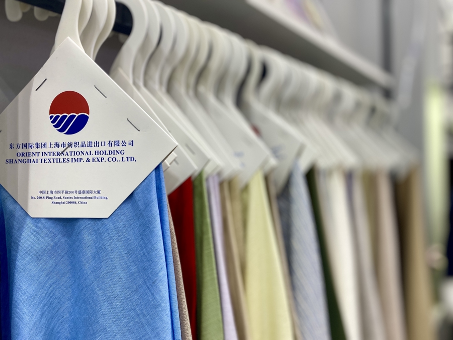 办公室里放着数以万计的样品,外销员抱着平板跟客户视频选面料,快递单上印着昨天发往美国的物流信息……在东方国际集团上海市纺织品进出口有限公司,日常就是这番忙碌景象。