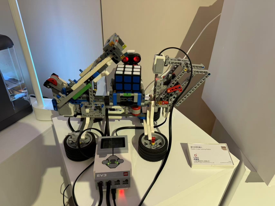 上海馆的智能设备,处处彰显硬核科技感。现场不仅有Fuzozo芙崽、MOMO香氛等可调节情绪的智能玩偶,及各类AI+教育陪伴机器人,更有来自消费级AR领军品牌XREAL的One Pro AR智能眼镜——该品牌已连续4年稳居全球消费级AR眼镜销量榜首。魔方还原机器人更是现场明星,37秒还原魔方的超强大脑,让不少观众大呼“不可思议”。据工作人员解读:“其核心原理是主控生成方案,视觉识别‘看’魔方,机械臂‘动’手完成还原。”