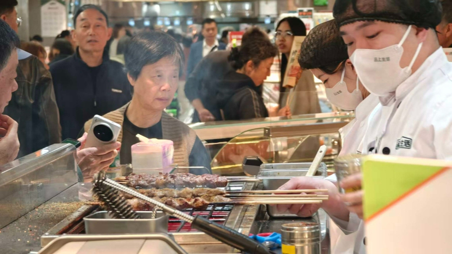 你能想象在一家超市里,居然有羊肉串烧烤摊吗?门店销售人员告诉记者,这样一串足足20厘米长的羊肉串,只卖不到10元。一根纯肉的台湾烤肠,也只要3块多。同样高性价比的还有各种烘焙食品。